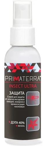 PRIMATERRA INSECT ULTRA - эффективное профессиональное средство от комаров, клещей и прочих кровососущих насекомых в формате спрея. Обеспечивает долговременную защиту от укусов на срок более 4 часов. Входящие в состав компоненты поддерживают максимальную эффективность средства на протяжении всего срока действия. Спрей легко наносится, не оставляет следов на одежде.