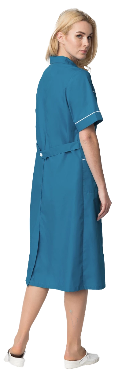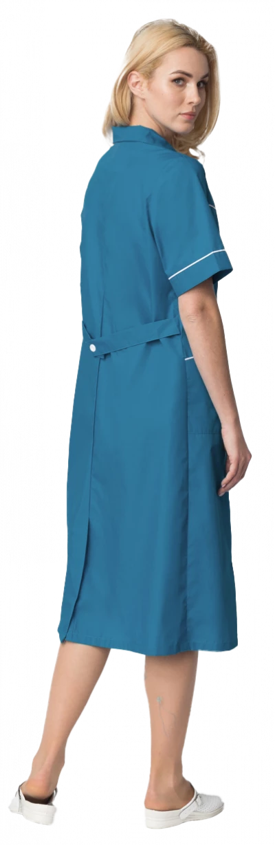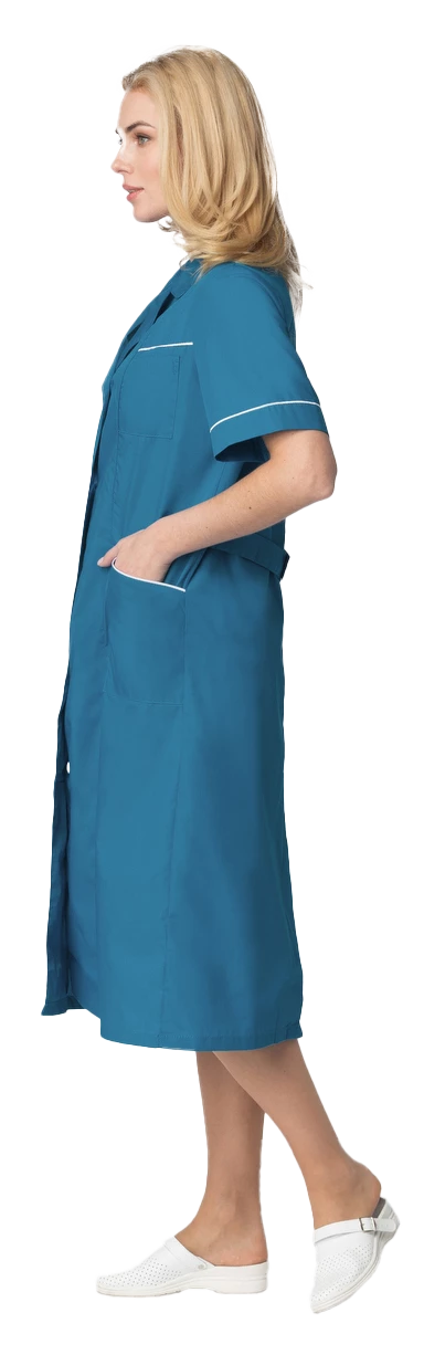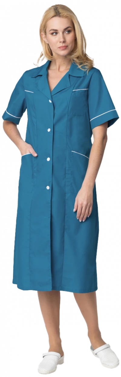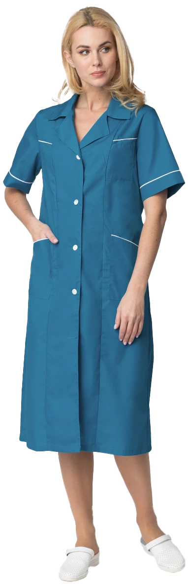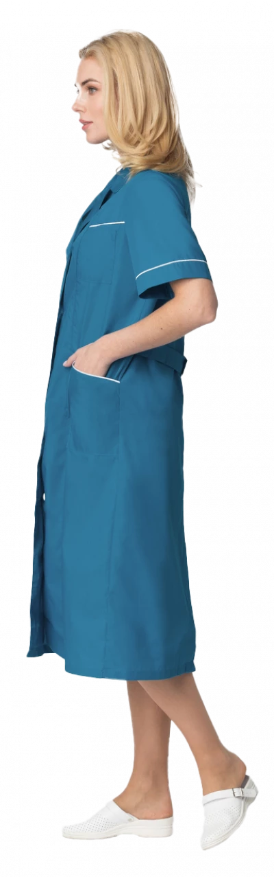Халат прямого силуэта, длина ниже колена. Центральная застежка на пуговицы, втачной короткий рукав. Задняя шлица. Отложной «английский» воротник. Боковые вместительные карманы, нагрудный ассиметричный карман. Регулировка объема по талии вшивным поясом на пуговице. Контрастным белым кантом отделаны кокетка, карманы и манжеты.