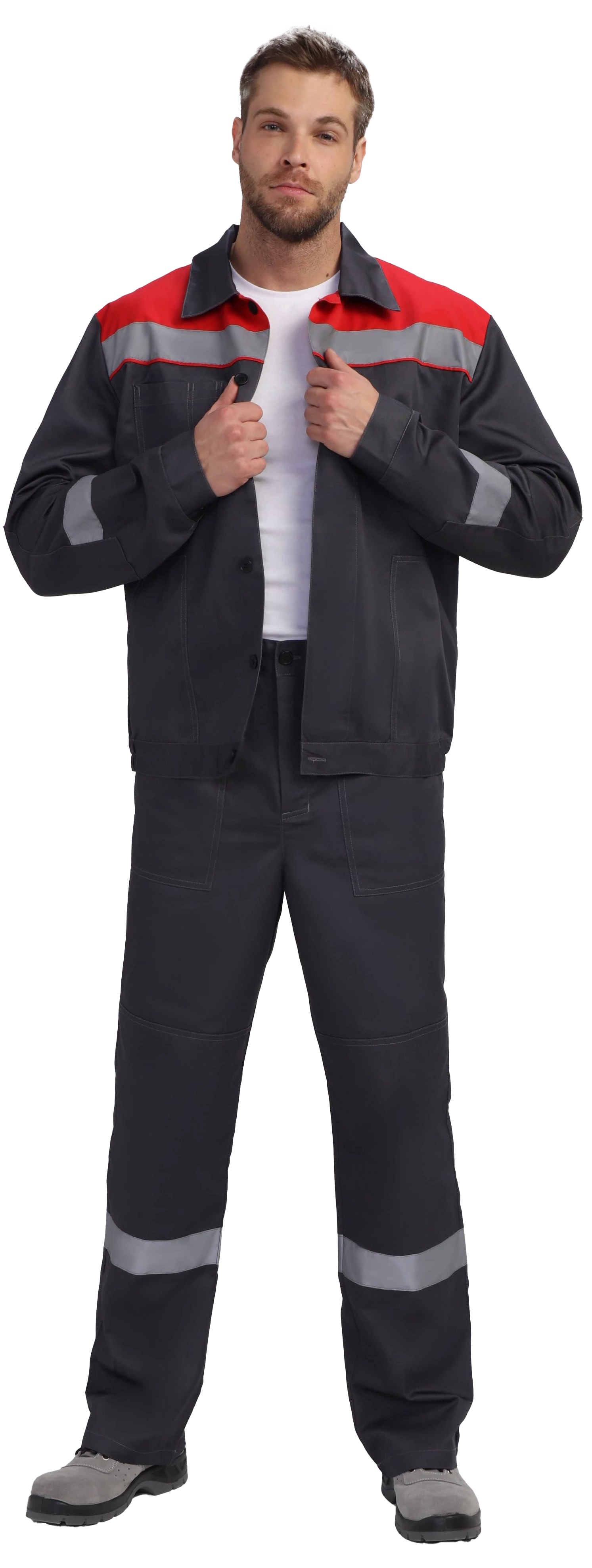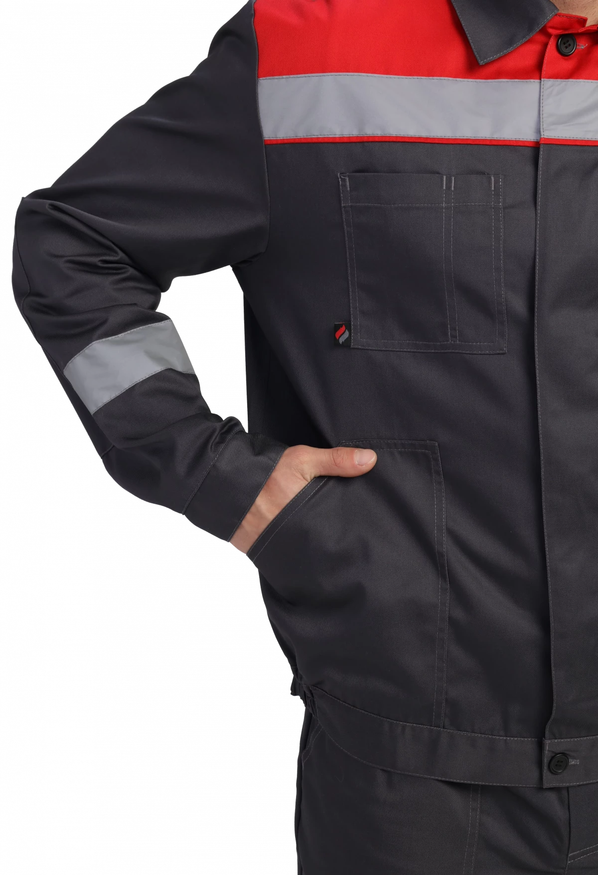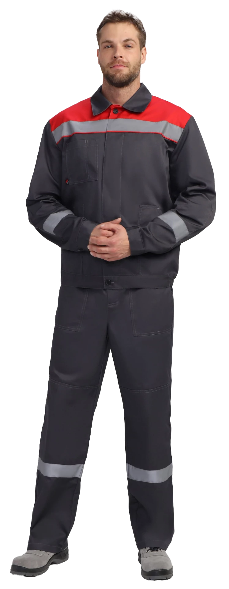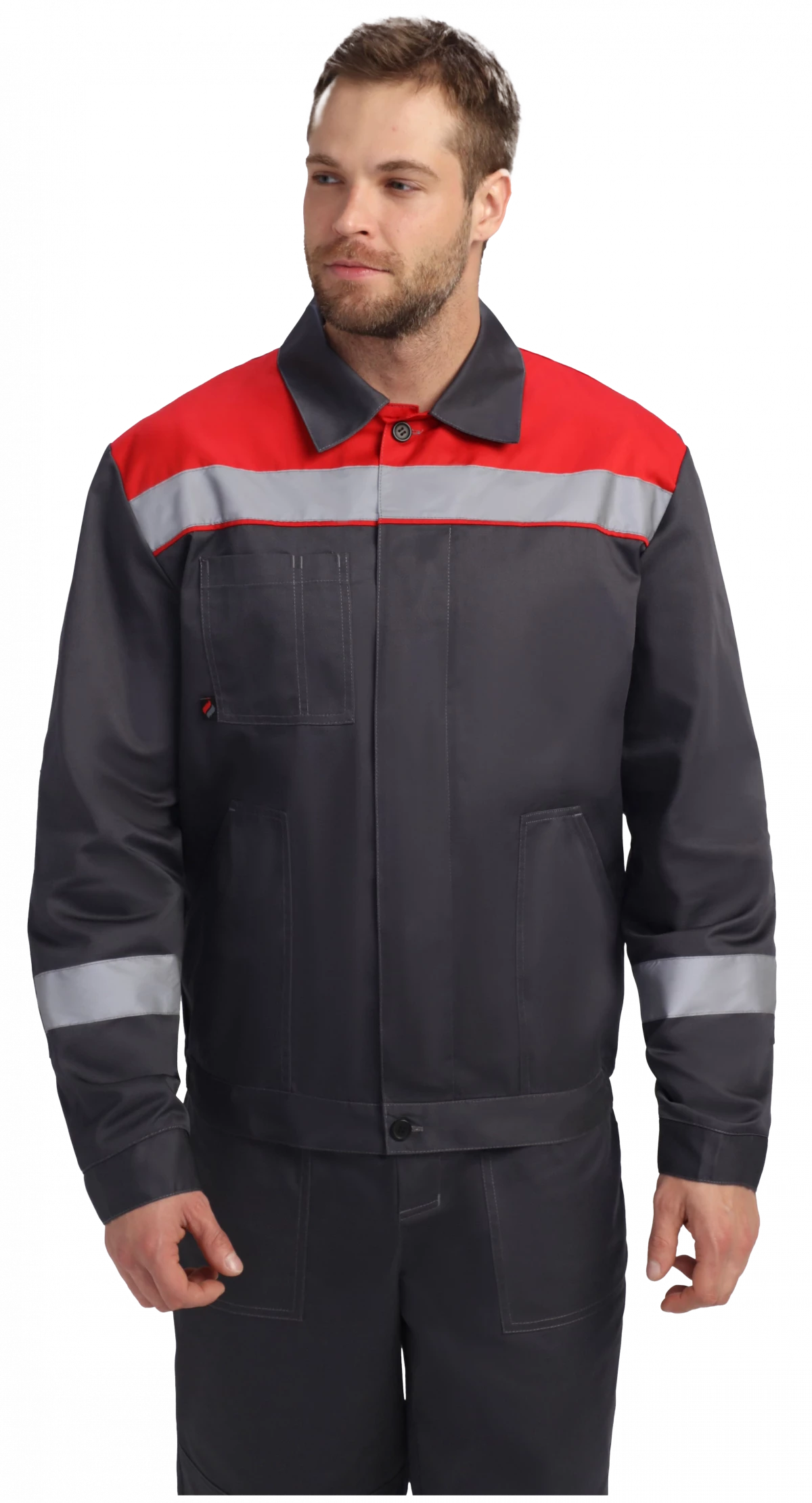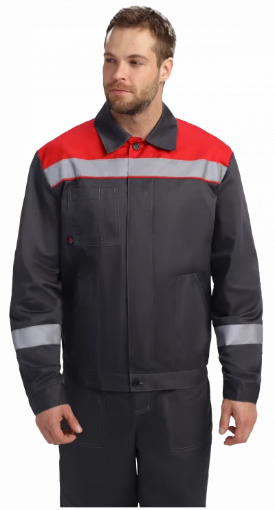 Куртка укороченная на поясе, центральная застежка супатная на петли и пуговицы. Два боковых кармана с наклонным входом, один нагрудный карман с отсеком для ручки. СОП 50 мм на кокетке и рукавах. Рукава с манжетами на пуговицу, усиленные налокотники. Воротник отложной. Усиленные швы