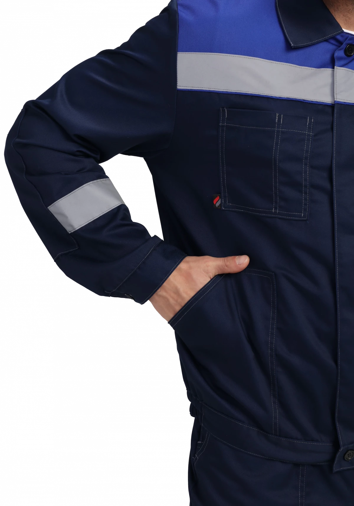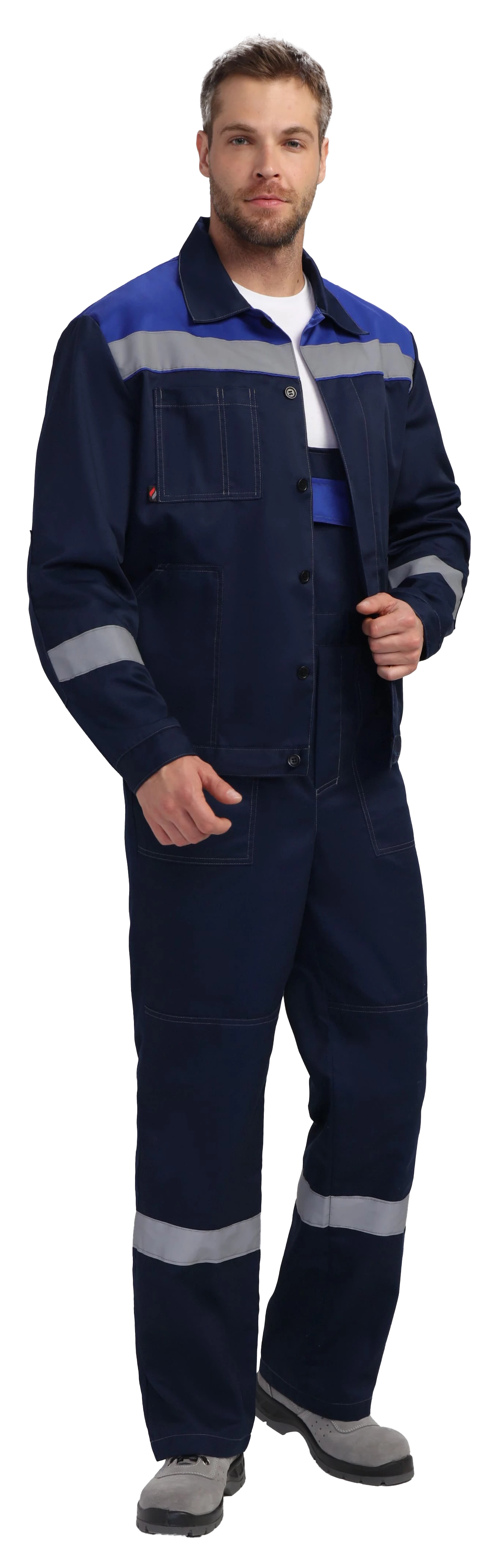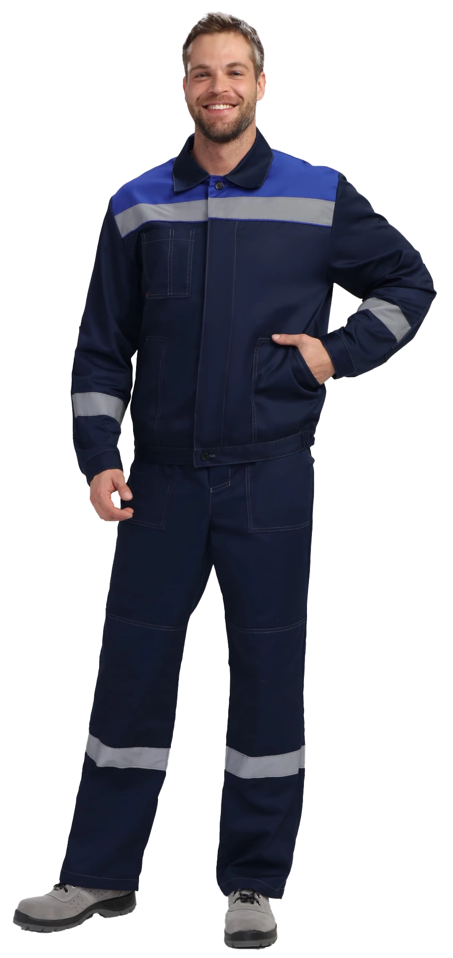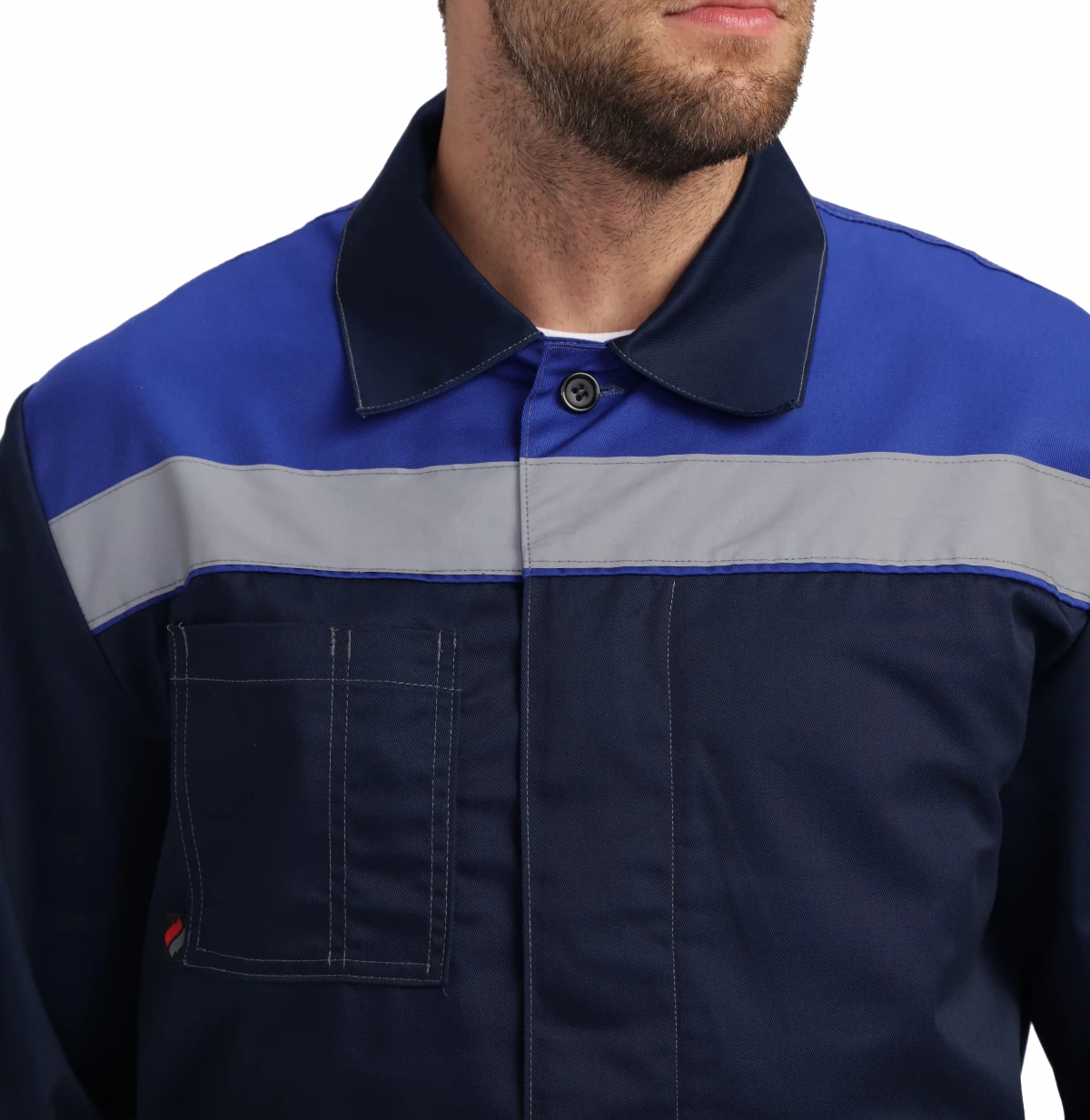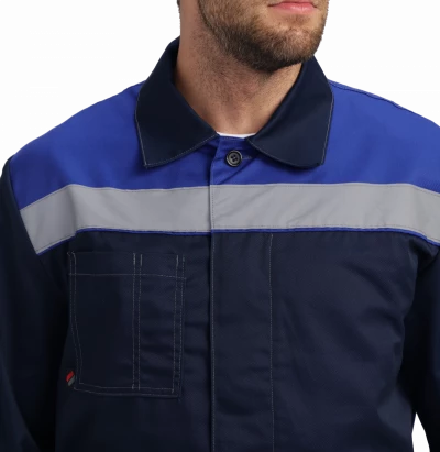 Куртка укороченная на поясе. Центральная застежка супатная на петли и пуговицы, два боковых кармана с наклонным входом, один нагрудный карман с отсеком для ручки. СОП 50 мм на кокетке и рукавах. Рукава с манжетами на пуговицу, усиленные налокотники. Воротник отложной, усиленные швы.