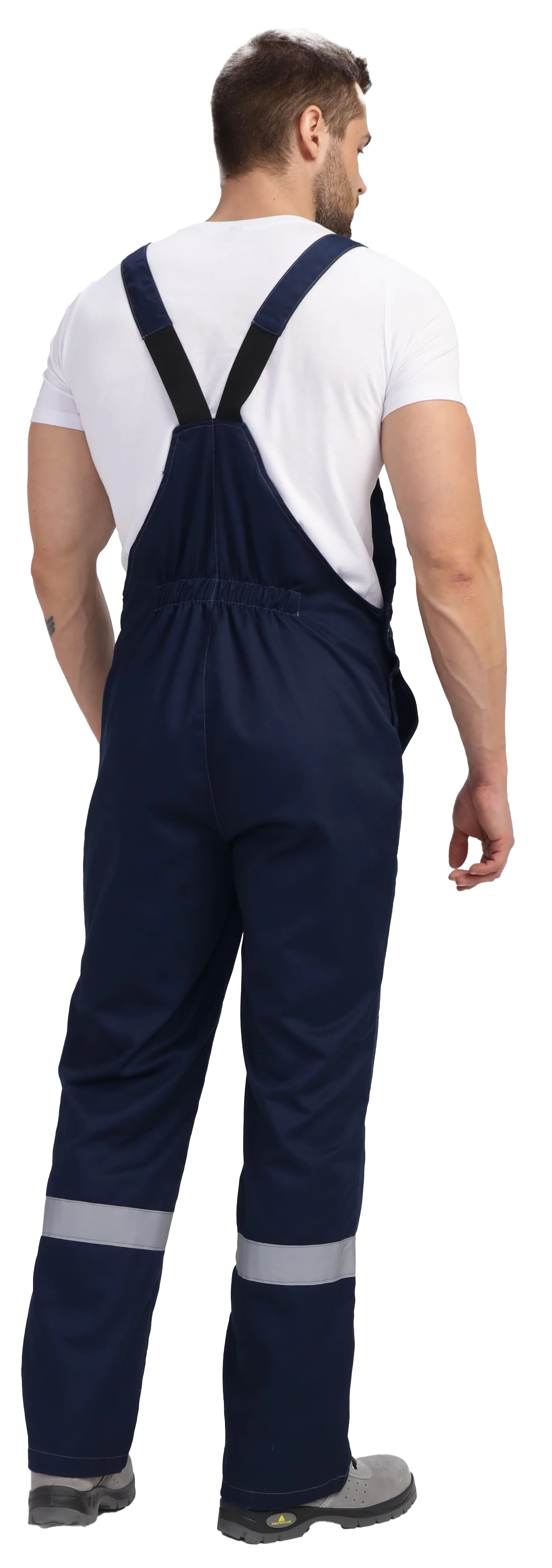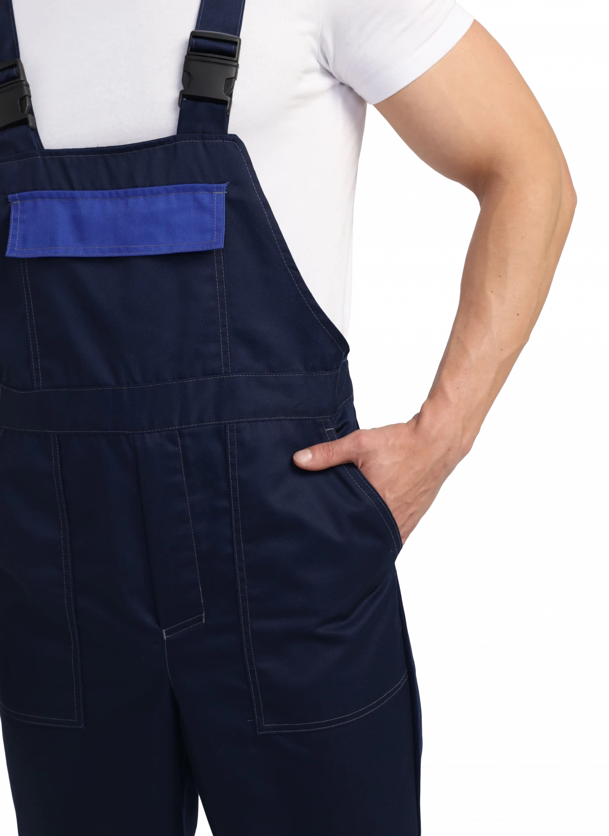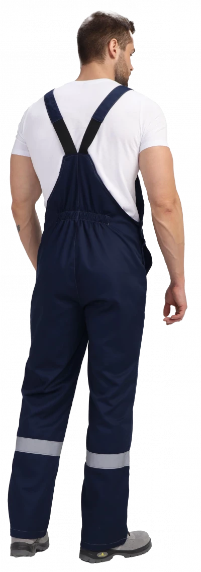 Полукомбинезон прямого силуэта. Нагрудный карман с клапаном, с гульфиком на молнии. Два боковых кармана. Усиленные наколенники. СОП по низу брючин 50мм.