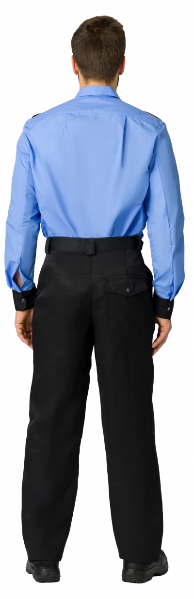 Мужская рубашка охранника с длинным рукавом на пуговицах, стойка на воротнике, погоны и на полочке, клапаны на карманах из отделочной ткани.