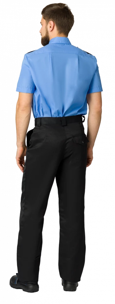 Мужская рубашка охранника с коротким рукавом на пуговицах, стойка на воротнике, погоны и на полочке, клапаны на карманах из отделочной ткани.
