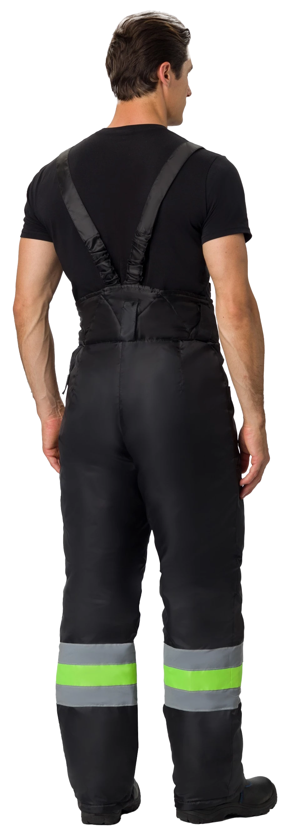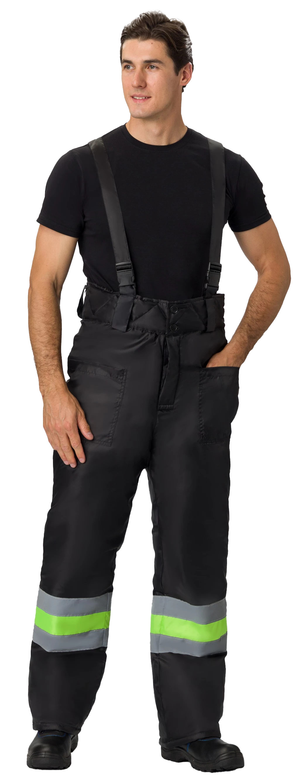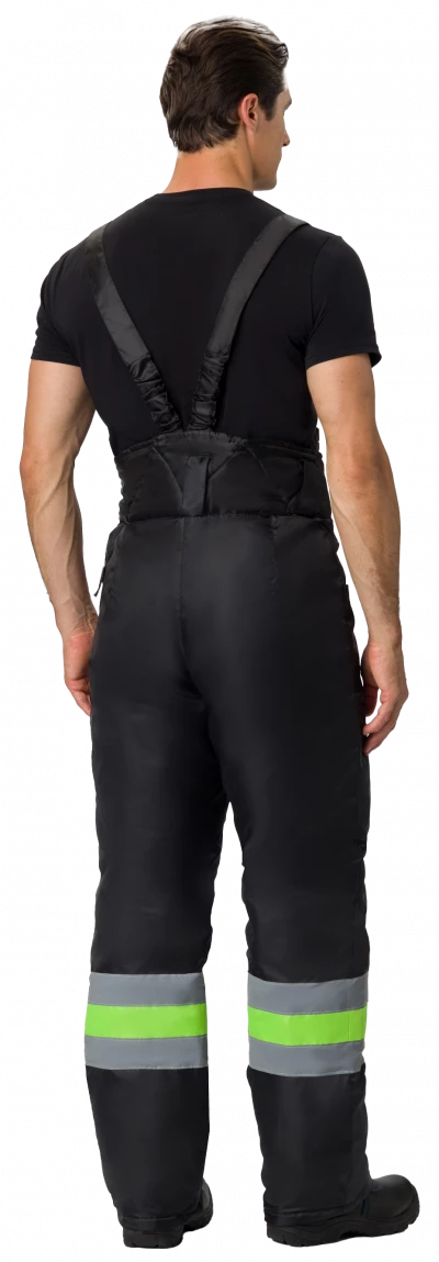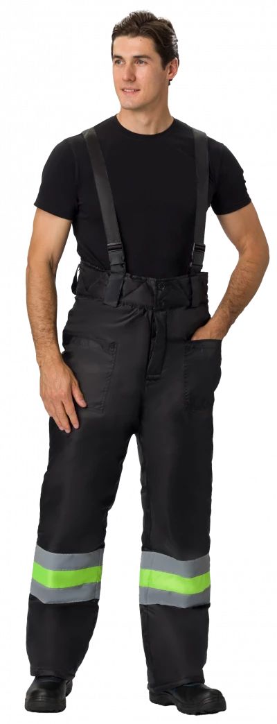 Брюки комбинированные со светоотражающими полосами, на регулируемых по длине бретелях, широкий утепленный пояс, два передних накладных кармана.