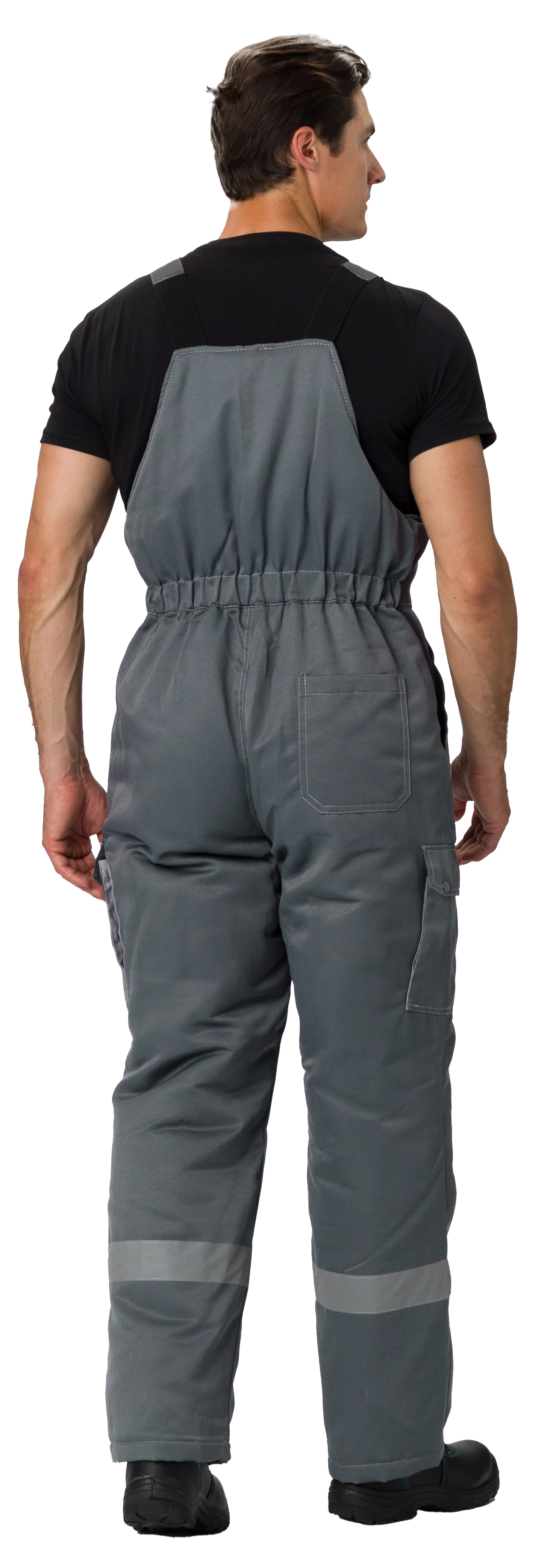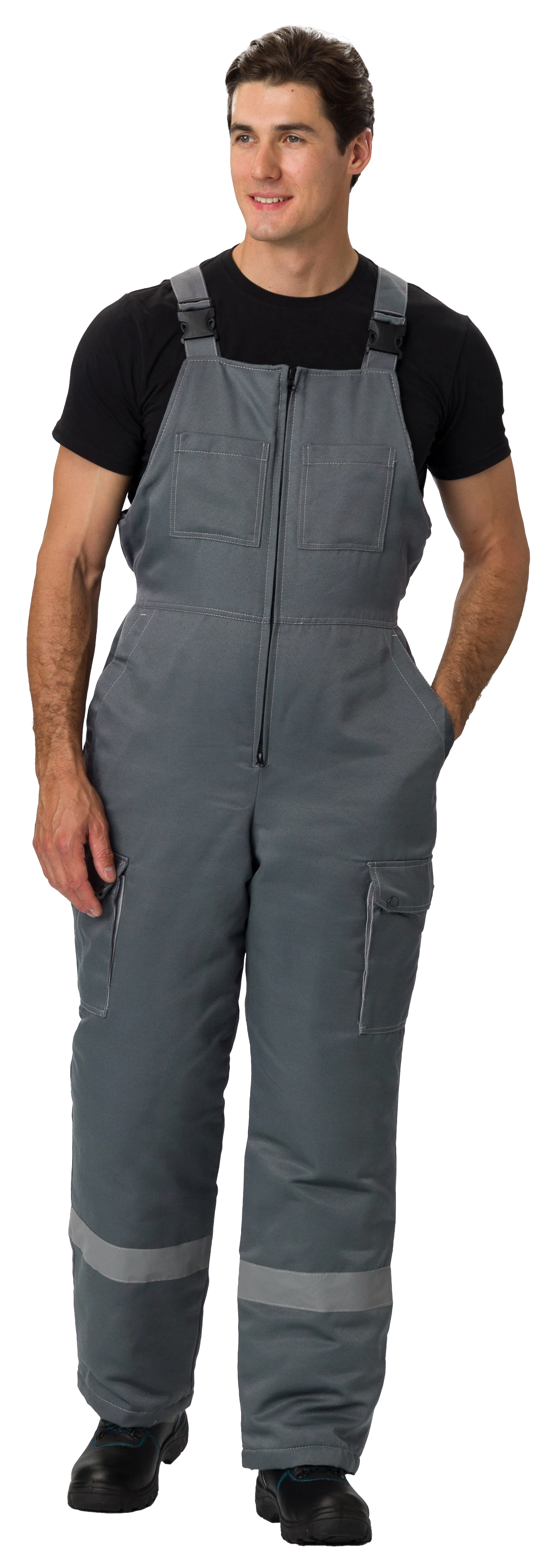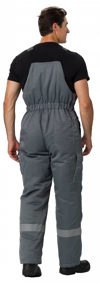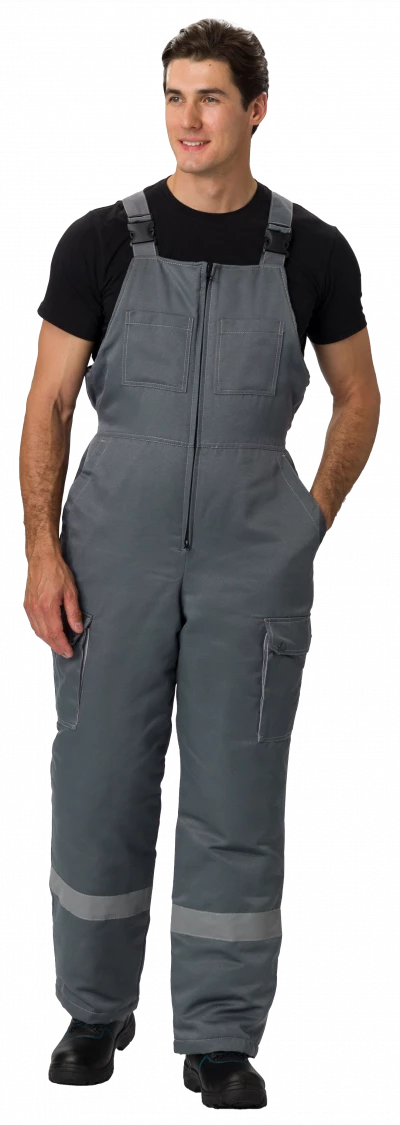 Полукомбинезон прямого силуэта с центральной застёжкой на тесьму «молния». На кокетку нашиты карманы, боковые карманы с наклонным входом. На боковой части располагаются объемные карманы, закрывающиеся фигурными клапанами с двумя кнопками. На правую заднюю часть полукомбинезона настрочен накладной карман со скошенными углами.