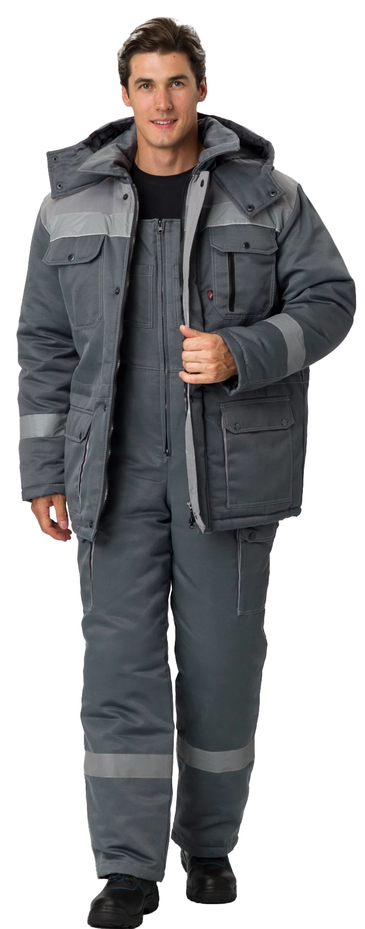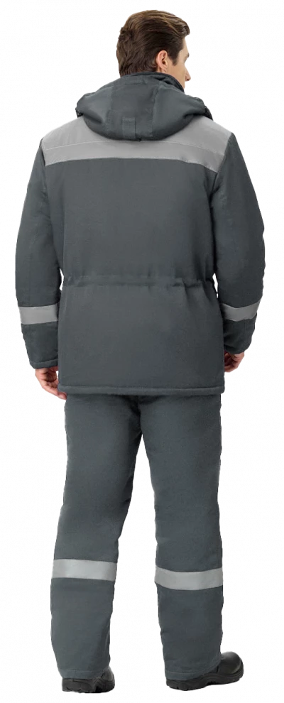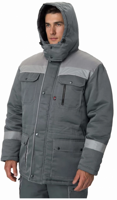 Куртка прямого силуэта с центральной застёжкой на двухзамковую молнию. Ветрозащитная планка застегивается на четыре кнопки. С подкладкой на кулисе по линии талии, с трикотажными напульсниками на рукаве. Верхние карманы накладные со скошенными углами, на кармане левой полочки карман с двумя входами: верхним и боковым с застежкой на тесьму «молния», нижние карманы с объемной вставкой, закрываются фигурными клапанами с двумя кнопками, внутренний карман. Воротник втачной отложной. Капюшон регулируемый, съемный на кнопках. СОП 50 мм.