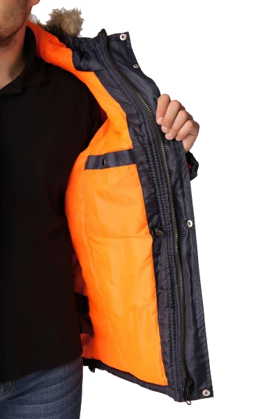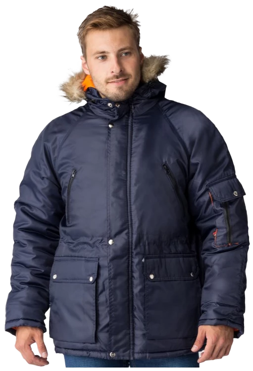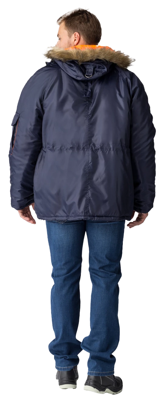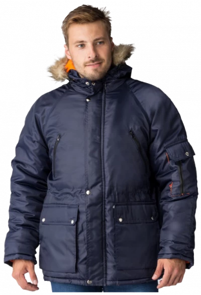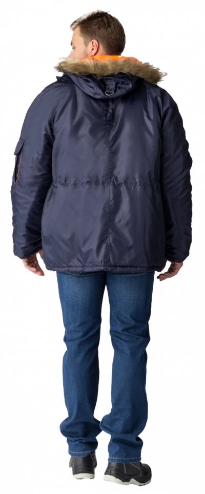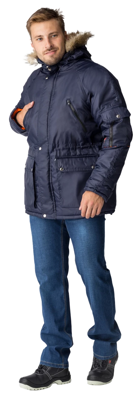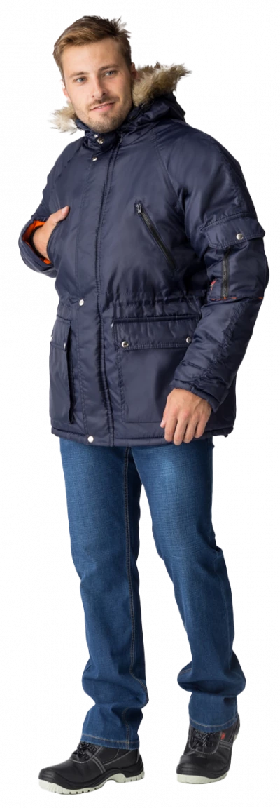 Полочки с нагрудными прорезными карманами с наклонным входом, застёгивающимся на тесьму – «молния», на полочках настрочены нижние сложные объёмные накладные карманы с двумя входами: верхним и боковым. Карманы с фигурными утеплёнными клапанами, застёгивающимися на две кнопки. Рукава – «реглан», двухшовные. На левом рукаве сложный накладной карман с двумя входами: с верхним - «полупортфель» и вертикальный на тесьму – «молния». Капюшон не отстегивается, по краю с меховой опушкой, лицевой вырез капюшона обработан обтачкой с кулисой для регулировки объема по лицевому вырезу. Высота капюшона регулируется патами с полукольцами на затылочной части.