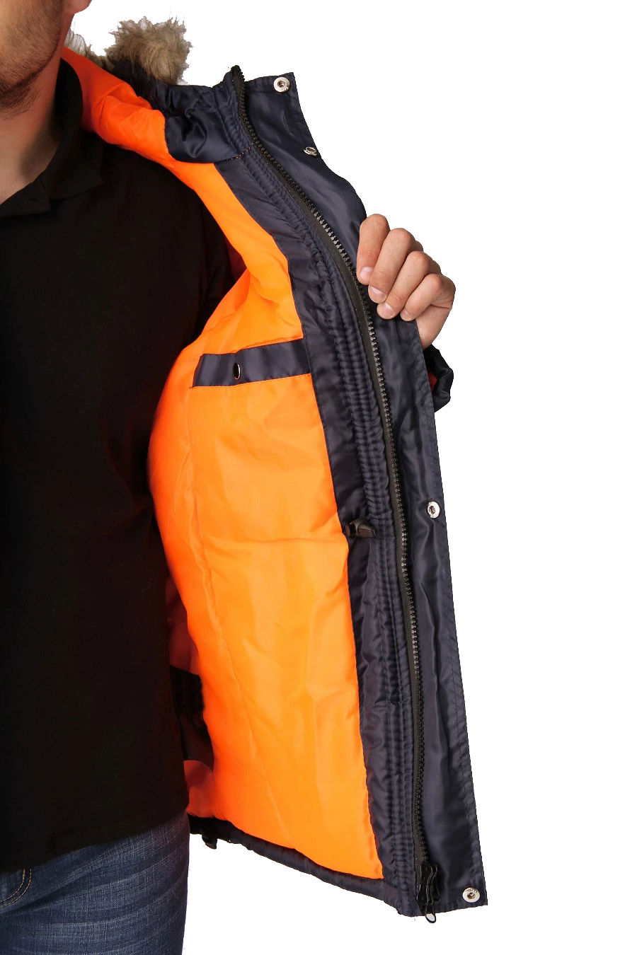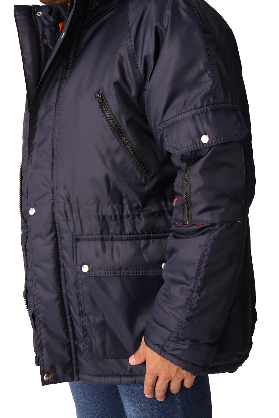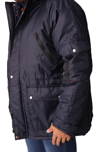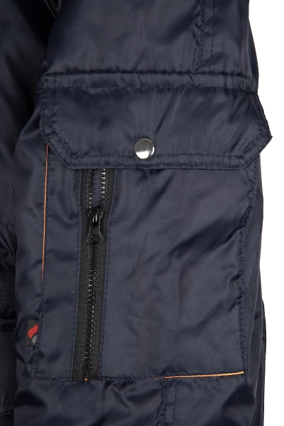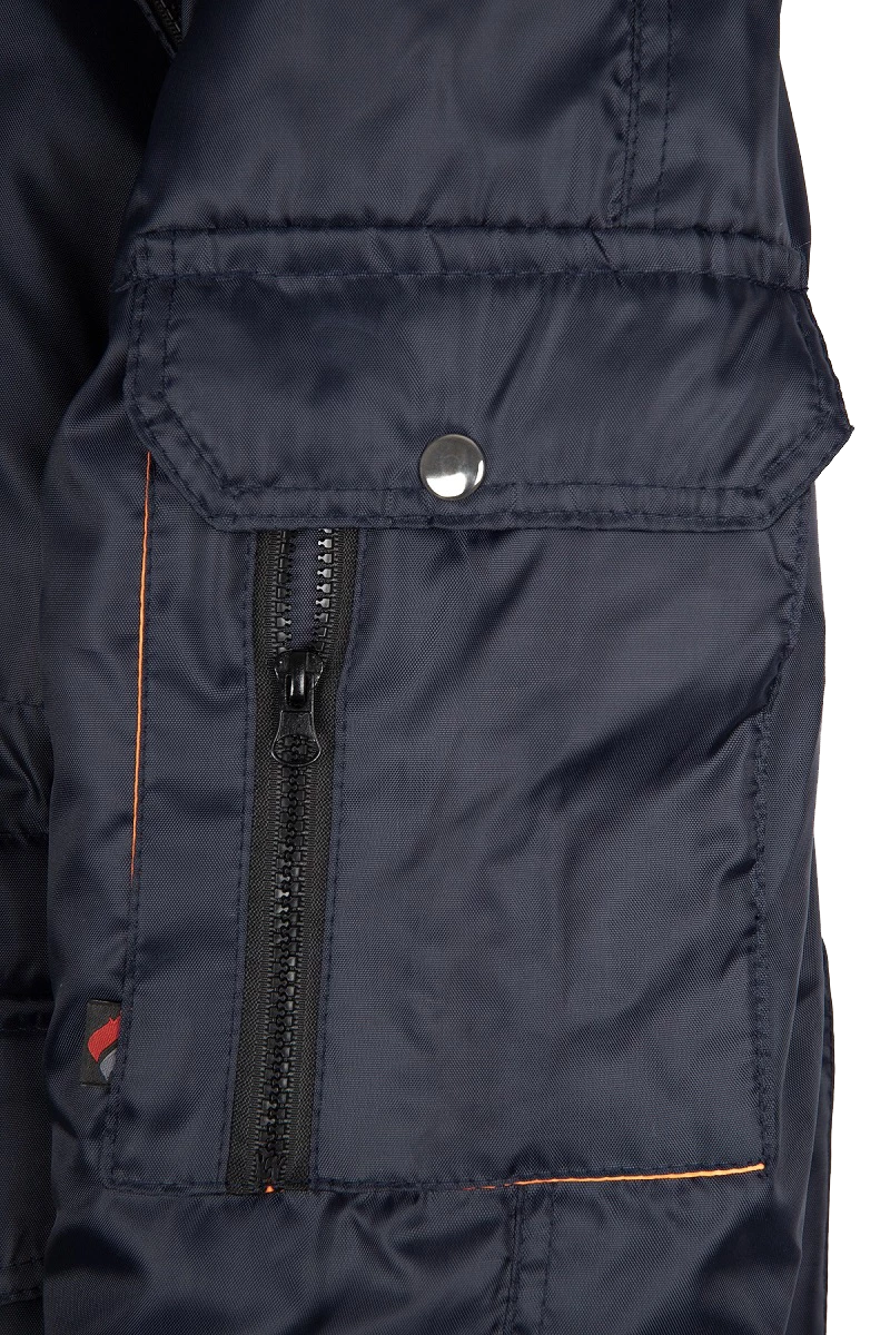 Полочки с нагрудными прорезными карманами с наклонным входом, застёгивающимся на тесьму – «молния», на полочках настрочены нижние сложные объёмные накладные карманы с двумя входами: верхним и боковым. Карманы с фигурными утеплёнными клапанами, застёгивающимися на две кнопки. Рукава – «реглан», двухшовные. На левом рукаве сложный накладной карман с двумя входами: с верхним - «полупортфель» и вертикальный на тесьму – «молния». Капюшон не отстегивается, по краю с меховой опушкой, лицевой вырез капюшона обработан обтачкой с кулисой для регулировки объема по лицевому вырезу. Высота капюшона регулируется патами с полукольцами на затылочной части.