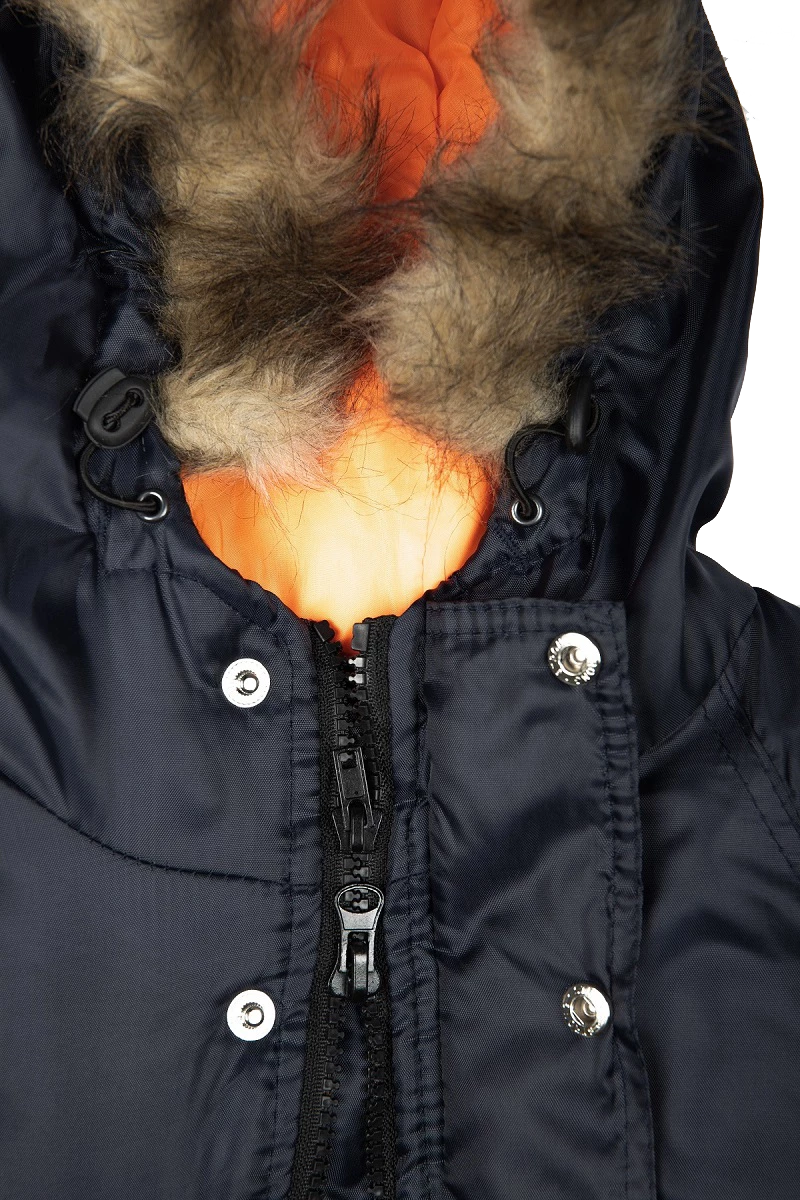 Куртка с центральной застёжкой на тесьму - «молния», с двумя ветрозащитными планками (внутренней и внешней): внешняя застёгивается на 4 кнопки. Куртка по линии талии на кулиске для регулировки объема. Низ куртки регулируется по ширине с помощью эластичного шнура.